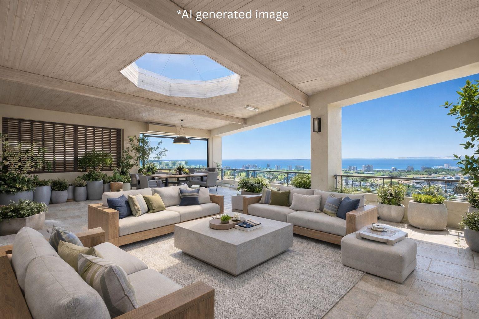 The open plan lounge opens onto a massive entertainment patio boasting sweeping city and ocean views, creating seamless indoor-outdoo....